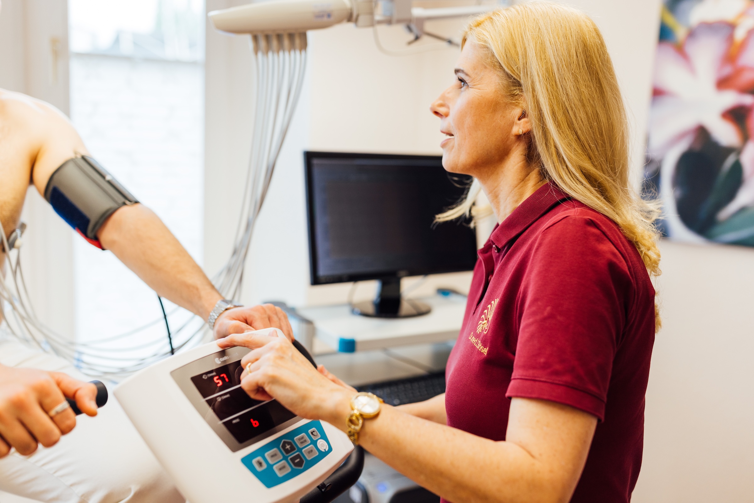 - Belastungs-EKG mit fortlaufender Herzfrequenz und Blutdruck-Registrierung